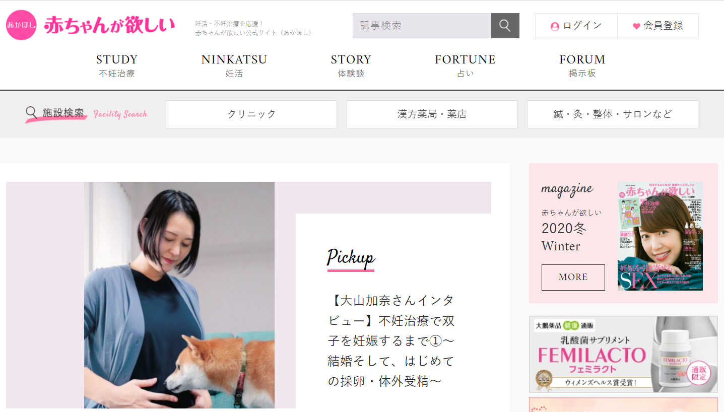 「妊活サプリ&ドリンクで妊娠力を底上げ!」「免疫力を高めて、産めるカラダづくり」「子宝神社&お寺ガイド」「妊活の新常識!着床&妊娠率を左右する!?子宮内フローラ」といった病院選び以外の記事も充実している。